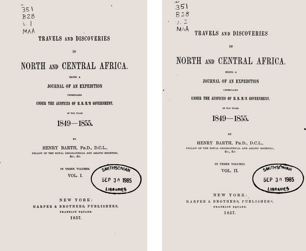 Publicação em dois volumes do estudioso e explorador alemão Heinrich Barth (1821-1865). Escrito a partir de uma viagem realizada nos anos 1849 a 1855. Barth trata com profundidade vários aspectos da vida no continente. Era fluente em Árabe e aprendeu línguas locais e é considerado o primeiro Europeu a se dar conta da riqueza das tradições orais para o estudo da cultura africana. Viajou por Magreb e Sudão.