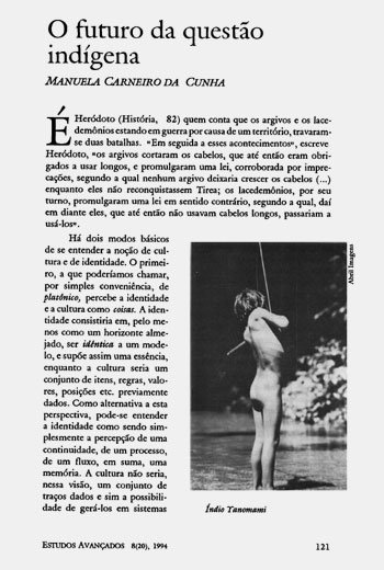 Publicação do Instituto de Estudos Avançados da Universidade de São Paulo, ensaio de 1994, com 16 páginas aborda algumas definições sobre identidade e cultura, fala percurso das populações indígenas e sua relação e papel na composição do Brasil contemporâneo e termina analisando alguns cenários, opiniões e opções para o futuro da questão indígena. Aponta a oportunidade que o país tem em colaborar e assegurar a posse das terras indígenas como forma de preservar suas riquezas e biodiversidade.