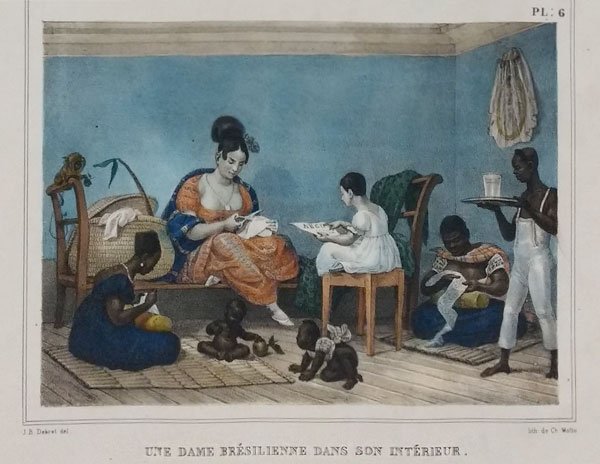Para penetrar mais na mentalidade da época escravagista Debret é um ótimo guia, pois percebia todos os estratagemas dos colonos para contornarem a condição de estarem na periferia do mundo civilizado, desprezava-os, mas não podia negar que eram eles os poderosos e isto obrigava-o a jogar o jogo, fingir estar diante de uma verdadeira aristocracia; restava-lhe então o sarcasmo, a arma dos impotentes. E ele foi muito sarcástico. Na litografia número 6, Uma dama brasileria em sua casa, a calma de seus personagens entretidos em suas distrações remete a uma intimidade sem tensões, uma afetividade silenciosa parece permear todo o ambiente. A jovem senhora domina a cena, até por suas proporções agigantadas em relação aos outros. Seu ar maternal parece distribuir-se igualmente à sua filha e a todos os presentes, aos escravos e aos dois bebês que brincam com tranquilidade. Mas toda essa calma é enganadora. Debret começa por nos instruir da presença do chicote bem ao alcance de suas mãos e comenta que a frequência com que dele ela se servia. Faz uma associação do pequeno mico-leão preso por uma corrente, com os dois bebês que não são mais do que “um alvo de especulação muito lucrativo”. Já desfaz assim qualquer esperança de que a jovem senhora teria por eles alguma consideração maior do que por seu mico acorrentado. Não deixa também de alfinetar a falta de instrução e a dificuldade da filha “já bem grande” que a custo consegue identificar as letras do alfabeto.