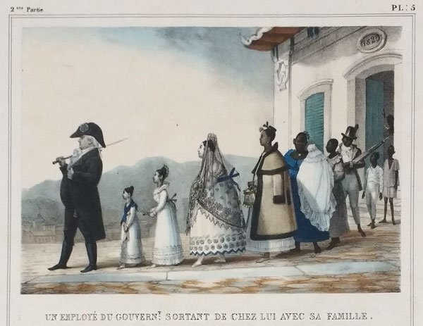 “A cena desenhada aqui representa a saída para um passeio de uma família de posses medianas na qual o chefe é um empregado do governo. De acordo com os usos antigos ainda observados nessa classe, o chefe da família vai à frente seguido imediatamente de suas crianças colocadas em ordem de idade com a mais nova sempre à frente. Vem em seguida a mãe, ainda grávida, atrás dela sua camareira, escrava mulata, infinitamente melhor considerada no trabalho que uma escrava negra, a seguir a ama-de-leite, negra, o escravo da ama, o negro doméstico do senhor, um jovem escravo que aprende o serviço, seguido de um negro novo, recentemente adquirido, escravo de todos os outros, e cuja inteligência natural, mais ou menos ativa, deverá se desenvolver pouco a pouco a golpes de chicote; o que guarda a casa é o cozinheiro [os itálicos são do próprio Debret]”.
