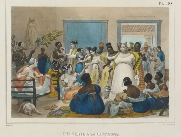 Nesta outra litografia temos a cena de um pequeno evento social. Seu título é Uma visita no interior. Foi realizada Debret nos conta sobre a rica senhora e sua família : “Quanto aos seus hábitos, nós a encontramos, segundo o uso de seus antepassados, exclusivamente ocupada com a supervisão e manutenção de sua numerosa família, ordinariamente composta de doze a quatorze filhos, e às vezes mais; porém, sujeita pelas exigências dos negócios a ter seus filhos em ocupações distantes, ela encontra consolação na gratidão de suas filhas que se revesam para vir, com suas pequenas famílias, lhe fazer companhia e enriquecer instantaneamente sua solidão de uma nova filiação igualmente cara ao seu coração […] Ao pé da marquesa, sentada sobre um tapete de Angola, uma de suas filhas, casada e mãe, aleita seu filho mais novo; atrás e perto dela, de joelhos, está sua negra, sua camareira; uma outra de suas escravas entrega o segundo filho de sua jovem senhora, o qual se recusa aos carinhos dessa senhorita estrangeira. Enfim, no primeiro plano, o primogênito da família, tão levado como seus dois irmãos, abandonando perto de uma negra algumas frutas que ele se dispunha a comer, se esconde sob a marquesa para subtrair-se aos olhares dos estrangeiros que entram; vício de educação muito comum a todas as famílias brasileiras. […] Atrás da senhora da casa, uma de suas jovens escravas encarregada da entediante tarefa de espantar moscas e pernilongos agitando dois ramos de árvores que ela segura com as mãos, oferece ao europeu o exemplo de um adicional de tristeza em seu cativeiro: o aflitivo espetáculo da máscara de ferro da qual o rosto dessa vítima está envelopado; sinistro indicativo da resolução que ela havia tomado de se matar comendo terra. Ao centro do grupo mais luminoso, a vizinha, de uma feliz obesidade e uma robusta saúde, apresenta-se majestosamente cercada de suas duas negras mocambas (camareiras), das quais uma se apressa a livrá-la de seu xale e a outra a lhe desembaraçar de seu chapéu de palha que ela ainda tem em sua mão”.