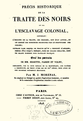 Joseph Morénas (1776-1830) foi um botanista e orientalista francês. Livro faz um apanhado da escravidão desde a antiguidade e é interessante por apresentar também um relato de como a escravidão doméstica versus o tráfico eram vistos pelos africanos. Discute aspectos legais, morais, de legitimidade e a posição dos colonos frente à escravidão.