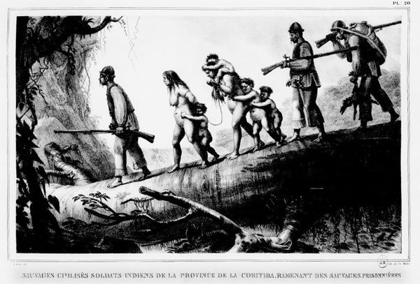 Essa predisposição e talento para as ações de ataque, emboscadas, assaltos e a falta de pudor com que retalhavam os corpos, exibiam troféus, colecionavam cabeças mumificadas, colares de dentes humanos, aprisionavam e devoravam seus inimigos, tudo foi logo percebido e utilizado pelos colonos. Primeiro, incentivavam as guerras entre tribos e trocavam os prisioneiros que lhes eram entregues por anzóis, facões, aguardente e bugigangas. Depois, “aculturavam” nativos para o sujo trabalho de capturar outros nativos para a escravidão, sem nem mesmo a desculpa de uma “guerra justa”. Na ilustração deste post, de Debret, todos são indígenas, tanto os prisioneiros como os guardas que os escoltam.